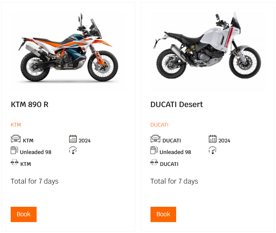 A powerful rental system should allow you to define and manage multiple motorcycle categories, such as: