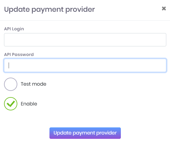 3.3. Enter your credentials: API login and API password. Disable “Test mode” and activate “Enable”.