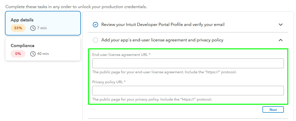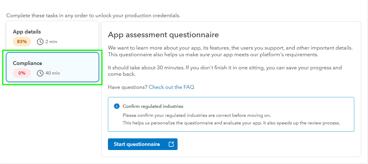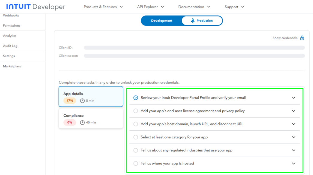 6.1. Scroll down to see tasks, that you need to complete to unlock your production credentials.