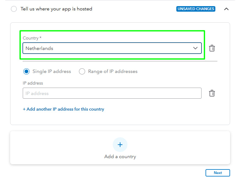 In this section please add Netherlands, IP addresses should be empty.