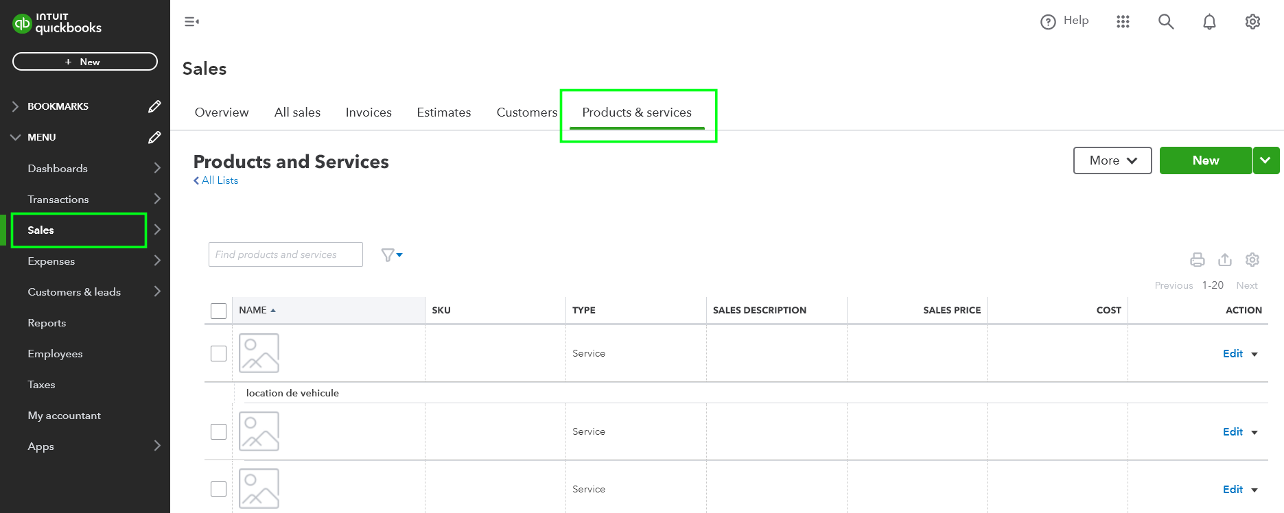 Right side options – you can see the products and services you create with Quickbooks that you offer to your customers.