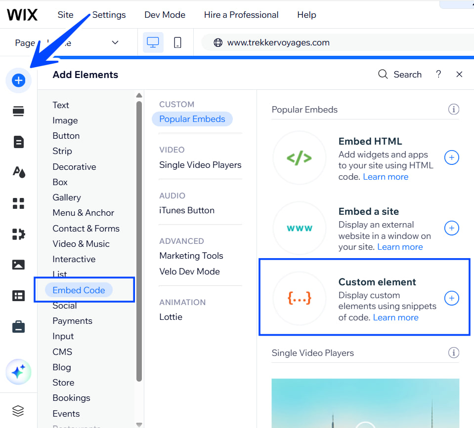 Select “Add Element”: Embed Code – Custom element