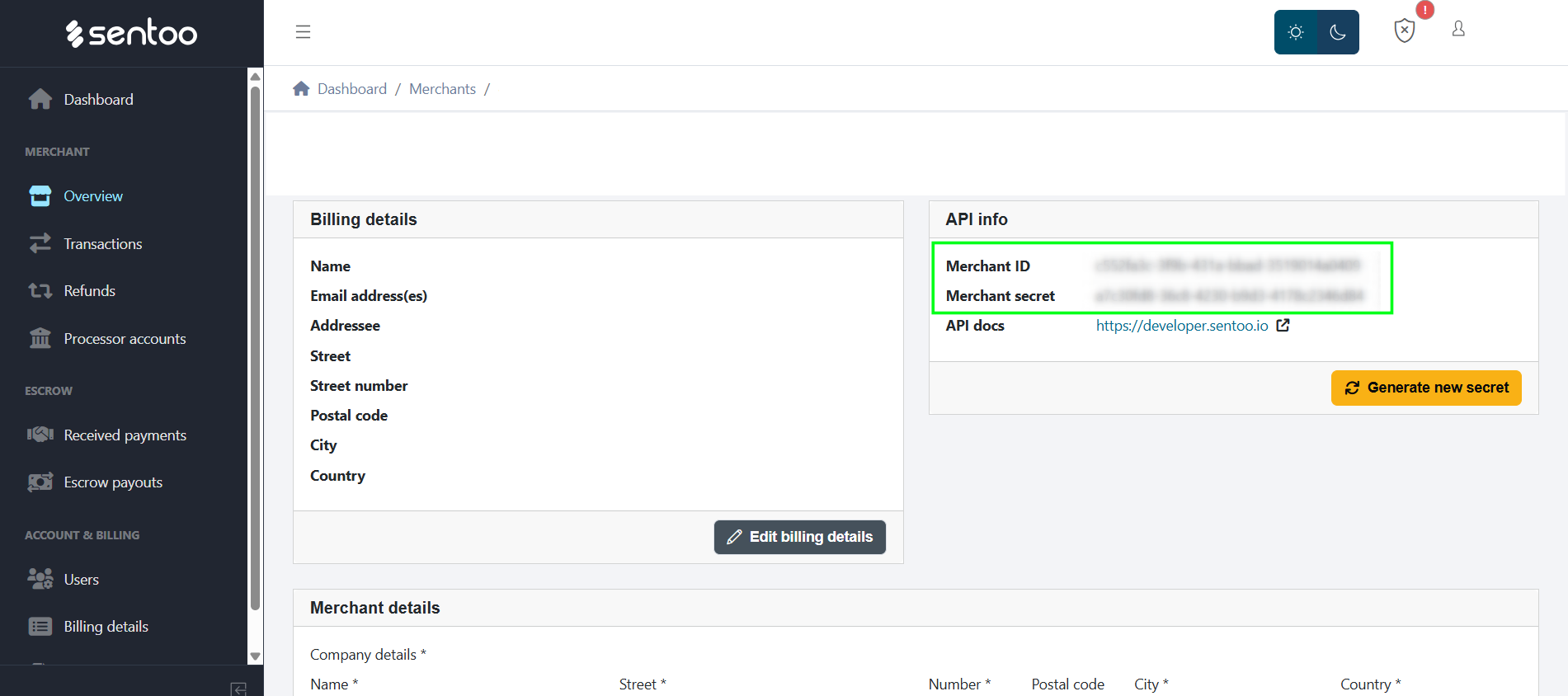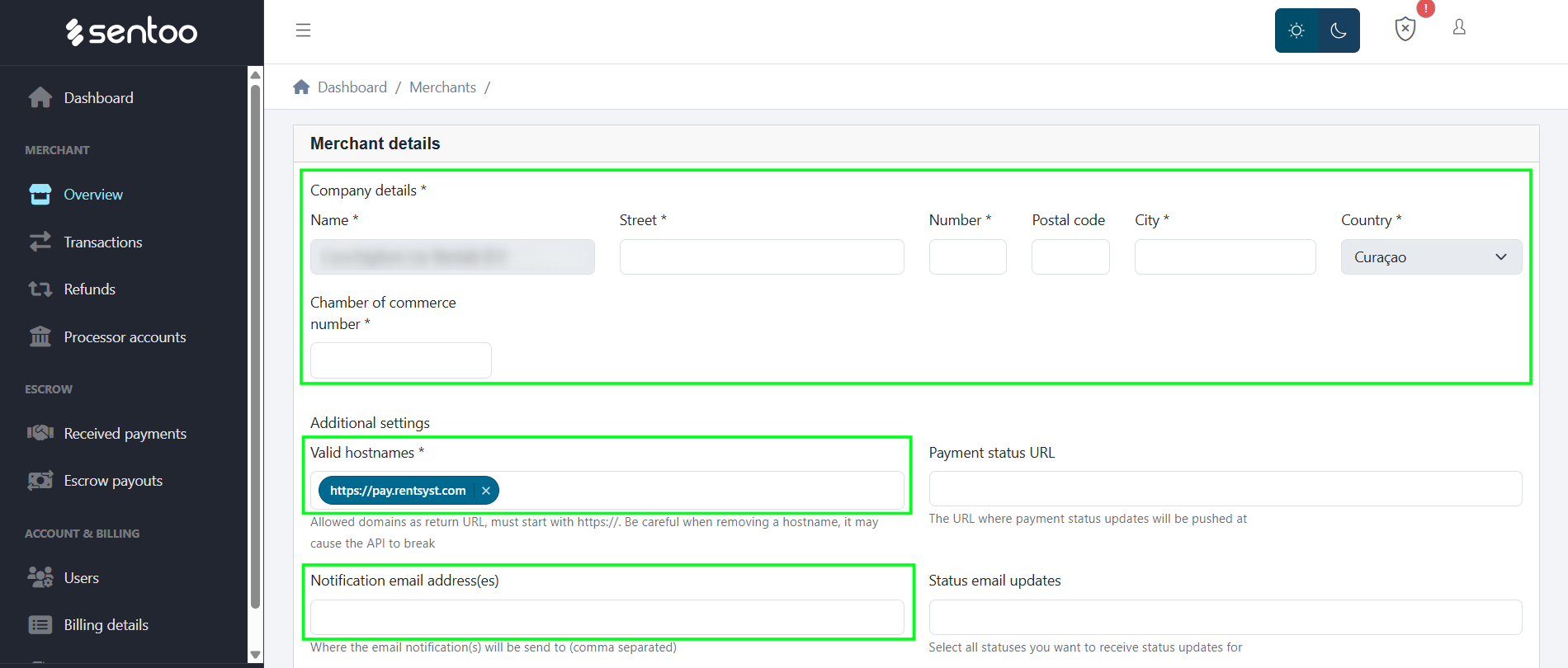 8. Copy Merchant ID and Merchant secret and navigate to RentSyst Settings – Integrations – Sentoo.