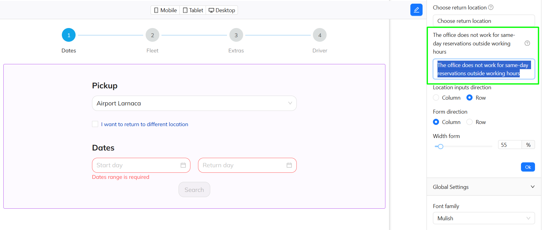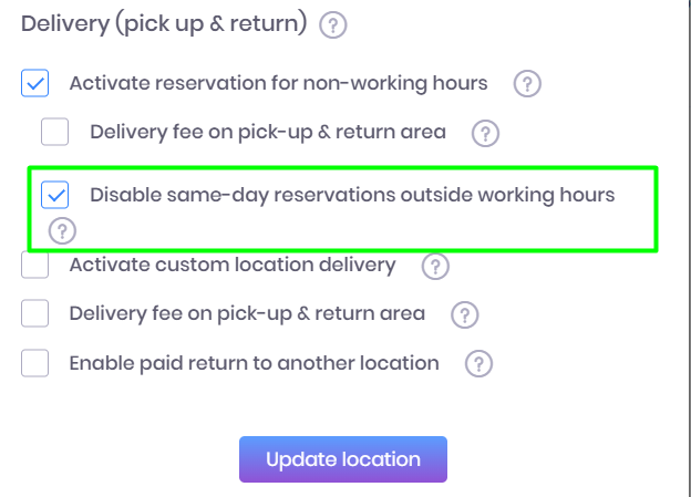 “The office does not work for same-day reservations outside working hours” – this scenario automatically displayed on the booking form in case your location was setup to prevent same-day reservations for non-working hours.