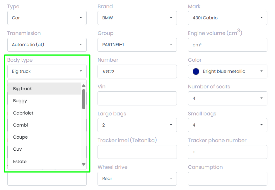 Body Type field values are now listed in alphabetical order for faster navigation and search of desired vehicle body