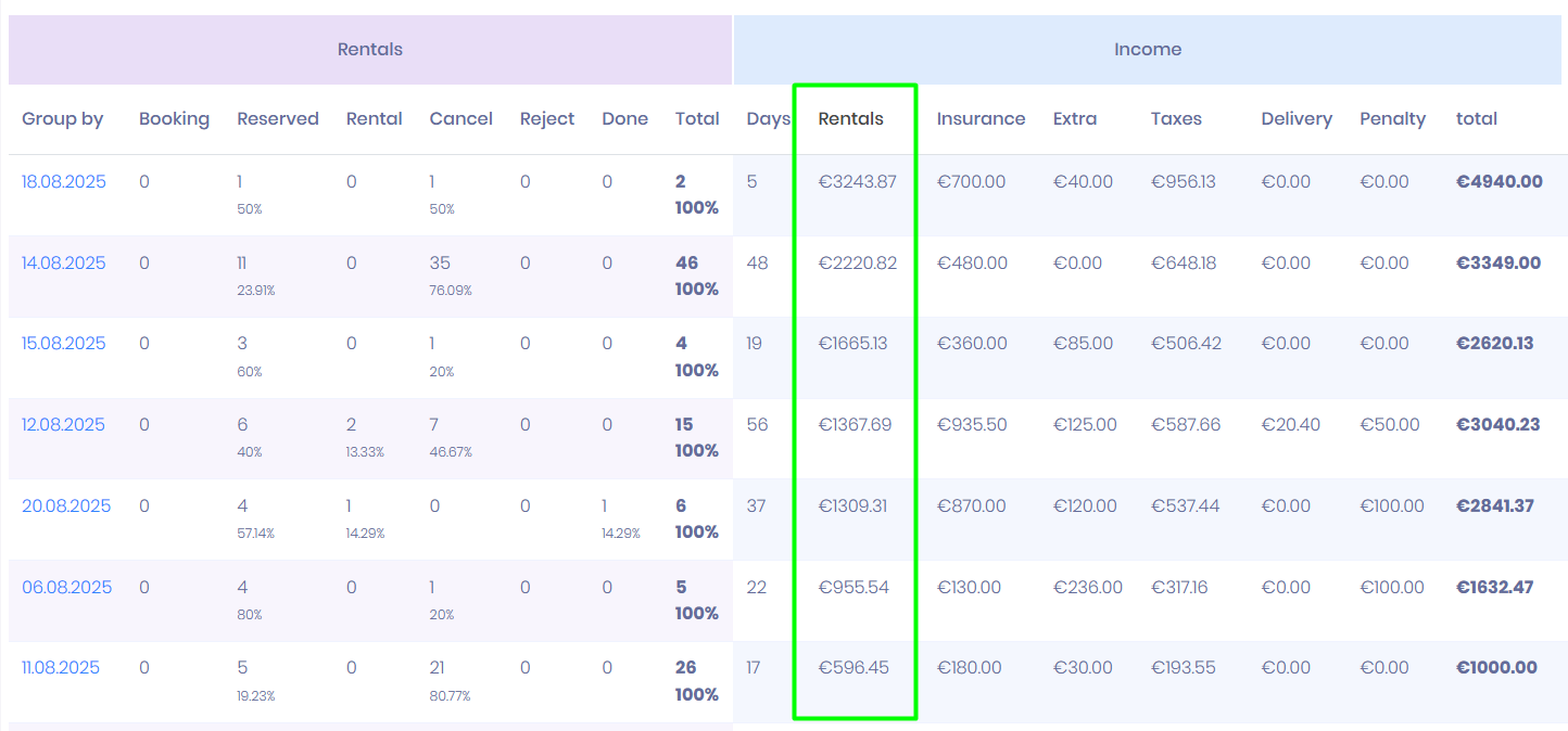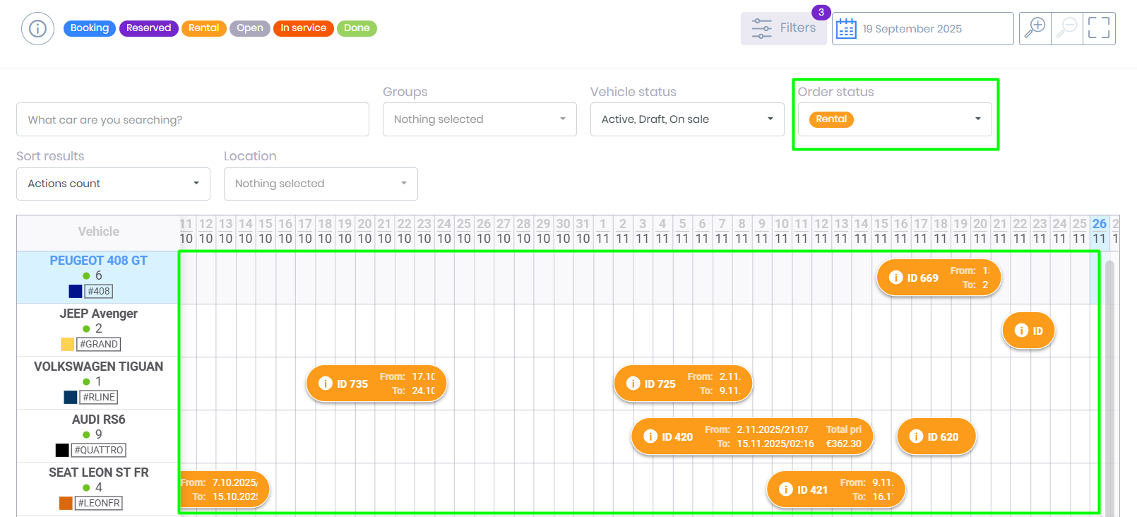 For instance you wanna see only reservations in progress, so we select “Rental”, and the system will display only rental status, and hide all the rest.