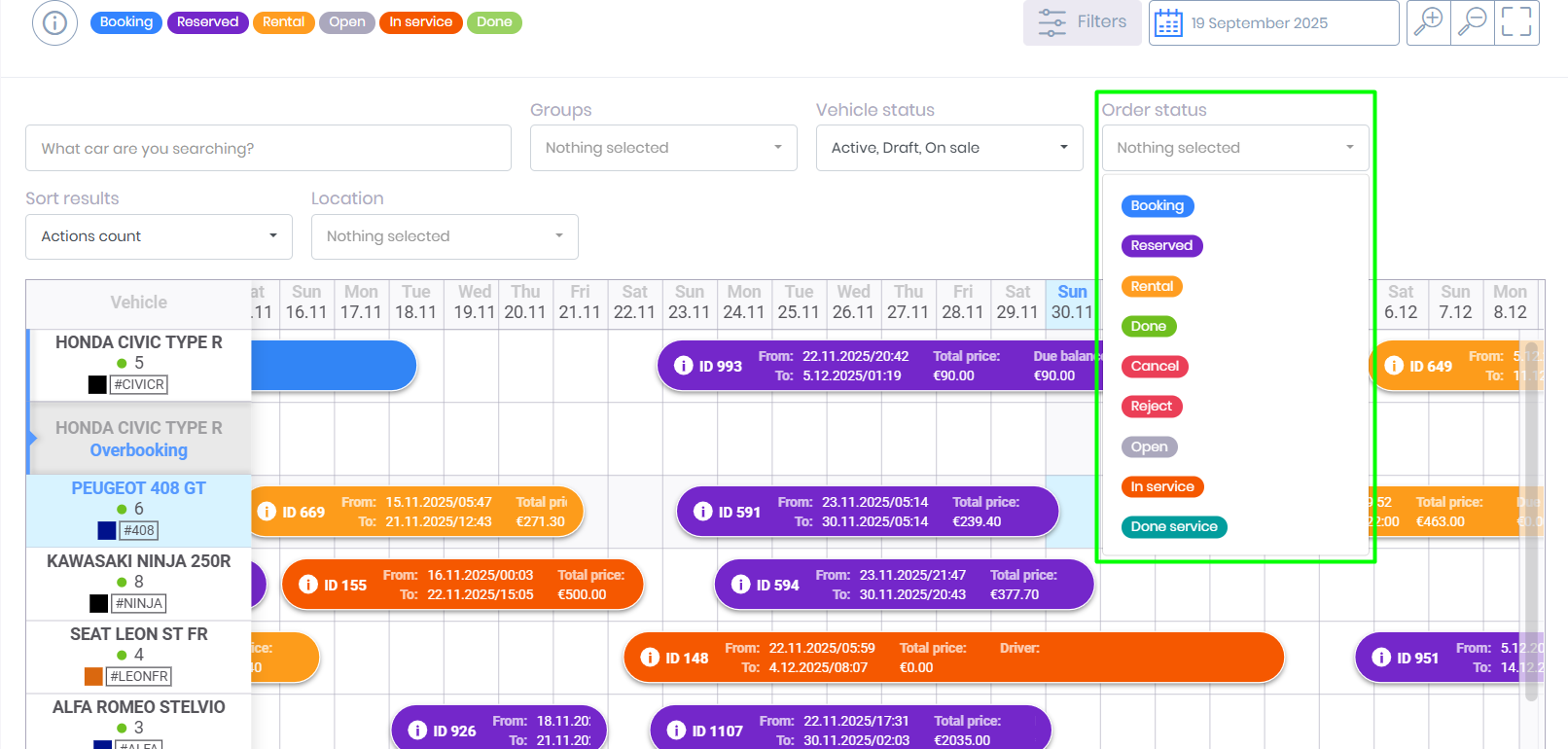By default, on the Timeline you see all order statuses. Now you are able to display only those reservations on Timeline, that you preselected with specific order status only.