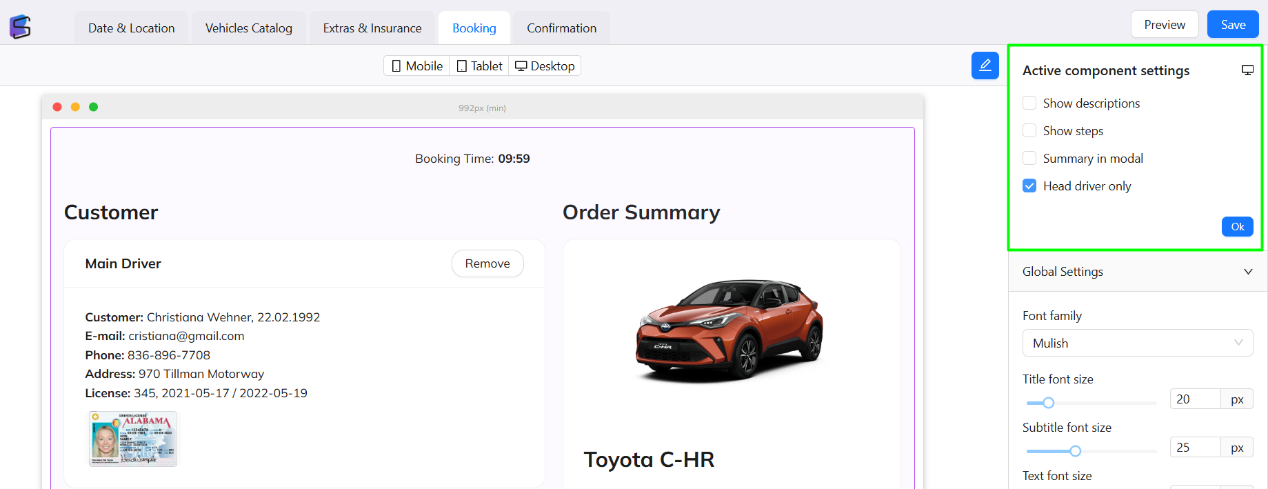 Go to Step 4 on the booking editor and Active component settings for the main window. On the right side menu you will see the checkmark “Head driver only“.