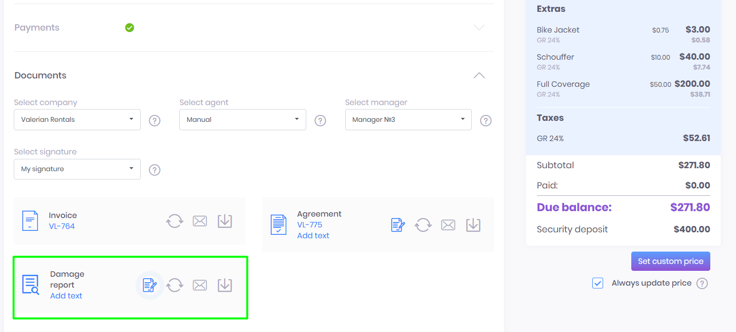 Now you are able to edit Damage Report template, embed e-signature, and send by email directly to customers. Also such a report you are able to manage directly inside the reservation profile.