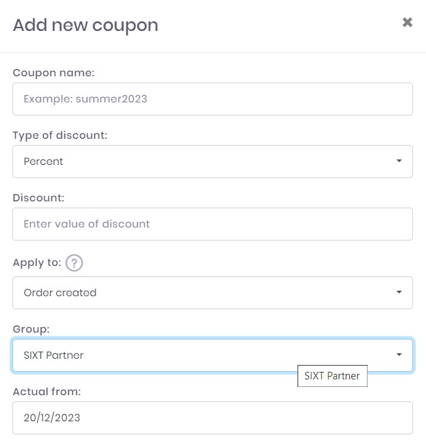 This option will allow you to create promo codes for Discount for specific vehicle categories. So you can build your coupons and apply for specific vehicle Groups or for all Fleet.