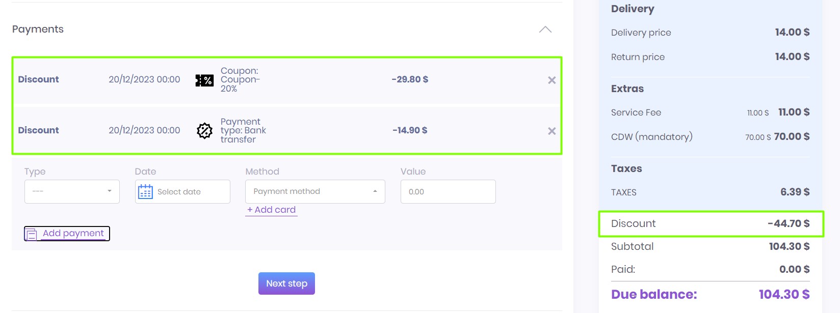 Discounts can be also visible on the Payments tab.