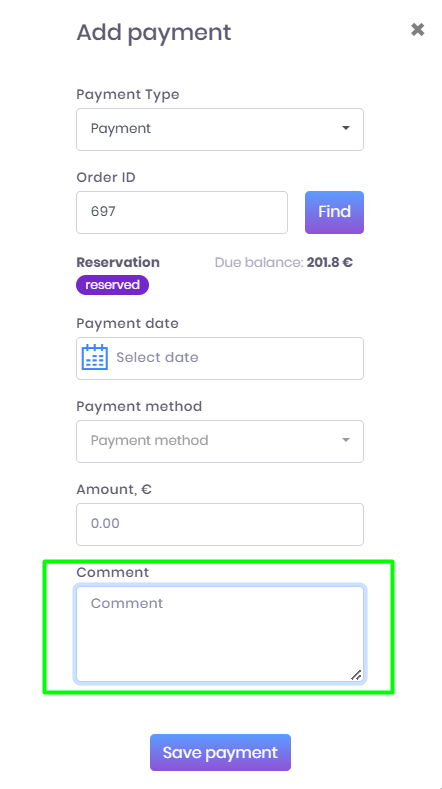 Step 2. In the pop-up window please indicate payment type, mark order ID to find it. Specify payment date and method, mark transaction amount and finally add your comment here. Press “Save payment”: