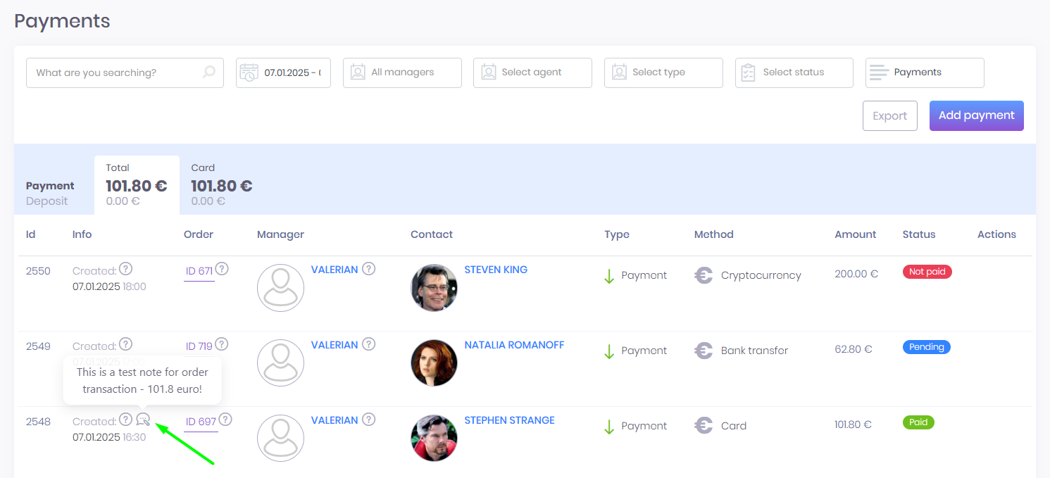 4. Payment tab – added new comment icon for memo and notes about payments.