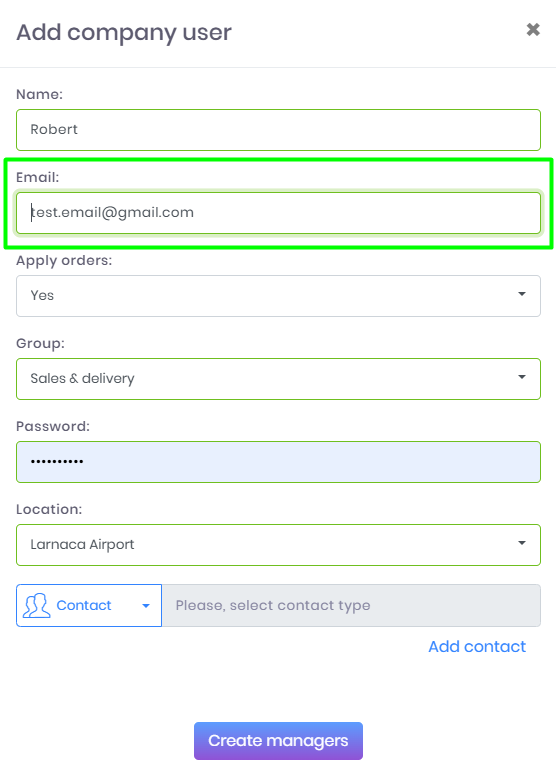 To assign this rule, you need to go in “Company & Managers” settings menu, open Managers profile and simply add managers email in pop-up window: