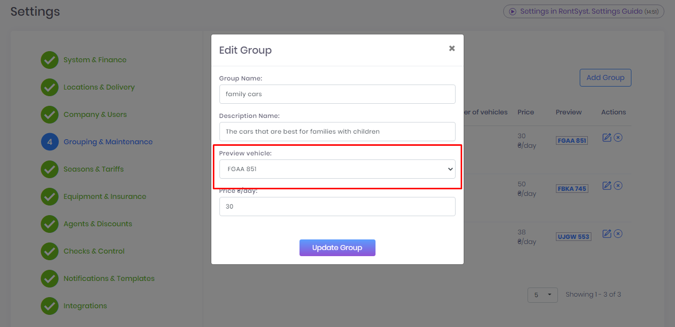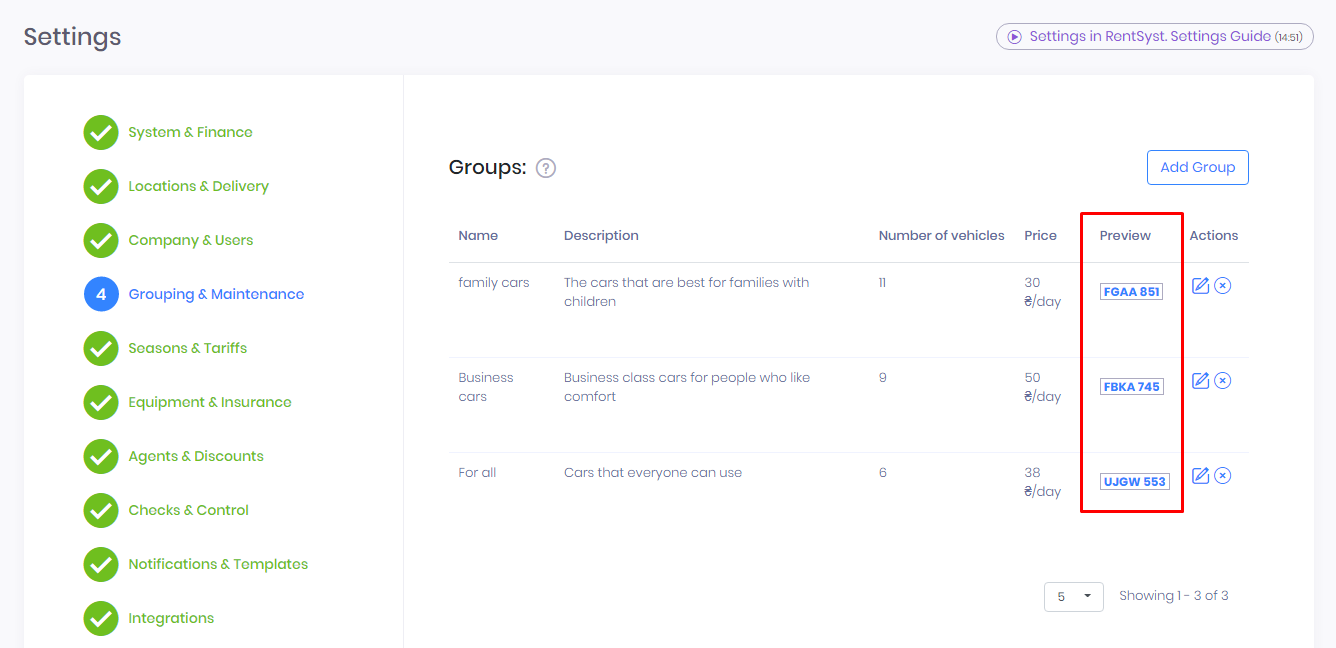 If you are using the type of reservation – Groups, you need to go to Settings, the Grouping & Maintenance tab, the Groups section and you will see the Preview column. This is the car that will be displayed in the plugin or iframe.