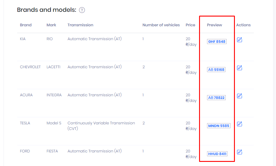 For those who use the type of reservation – Brands, you also need to go to Settings, the Grouping & Maintenance tab, the Brands and Models section and you will see the Preview column. This is the car that will be displayed in the plugin or iframe..