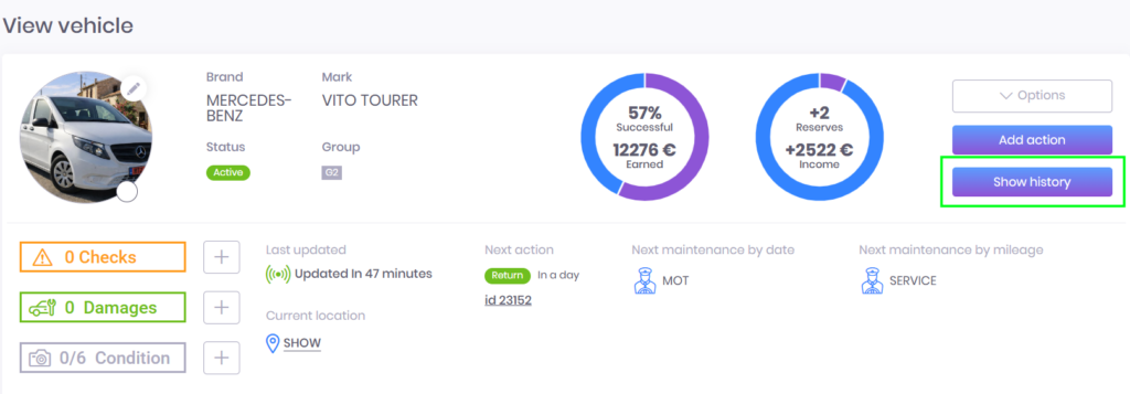 In the vehicle on which the sensor is installed, you can watch its movement history. To do this, go to the card of the car on which our sensor is installed. You will see the “Show history” button.